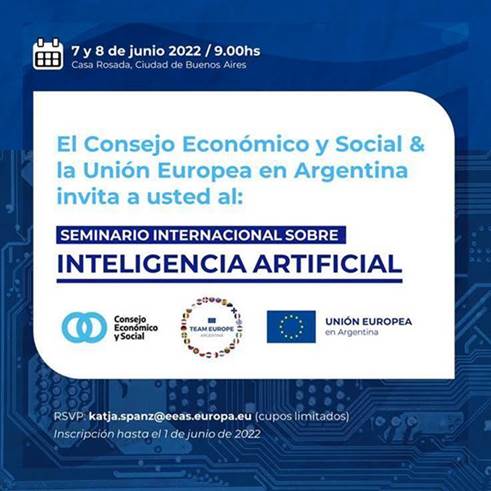 Es un gusto saludarlos desde la Delegación de la Unión Europea en Argentina en la oportunidad de hacerle llegar una amable invitación al Seminario sobre Inteligencia Artificial que se desarrollará el martes y el miércoles 7 y 8 de junio en la Casa Rosada.