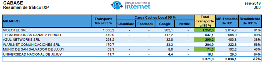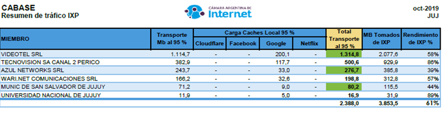 A partir de varias consultas a partir del reporte de ayer, los consumos de transporte de cada miembro del IXP aparecen en los reportes de CABASE. Desde que tenemos los reportes ejecutivos de CABASE, aparecen en un cuadro con un formato amigable. Acá están los últimos tres de noviembre, octubre y setiembre. En noviembre aparecen variaciones sustanciales respecto a los meses anteriores por el crecimiento de tráfico y la nuevas conexiones