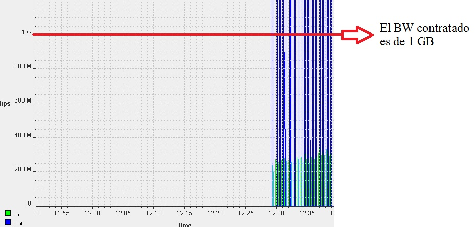 Estimado tal como se le informó a Alejandro Cuadras, el servicio tiene contratado 1 GB de ancho de banda el cual al realizar la gráfica del consumo ( tal como se muestra a continuación), se observa que el enlace se encuentra alcanzando el bandwich contratado, por lo que esto implica que manifiesten degradado. Alejandro Cuadras nos comunica que deberían tener 2 GB de bandwich en donde se le manifestó que por sistema aún no fue actualizado. Por favor comunicarse con la mesa, a quién pongo en copia para que pueda canalizarle los avances del UPGRADE. Adjunto la gráfica de la saturación y el consumo por la interfaz física;