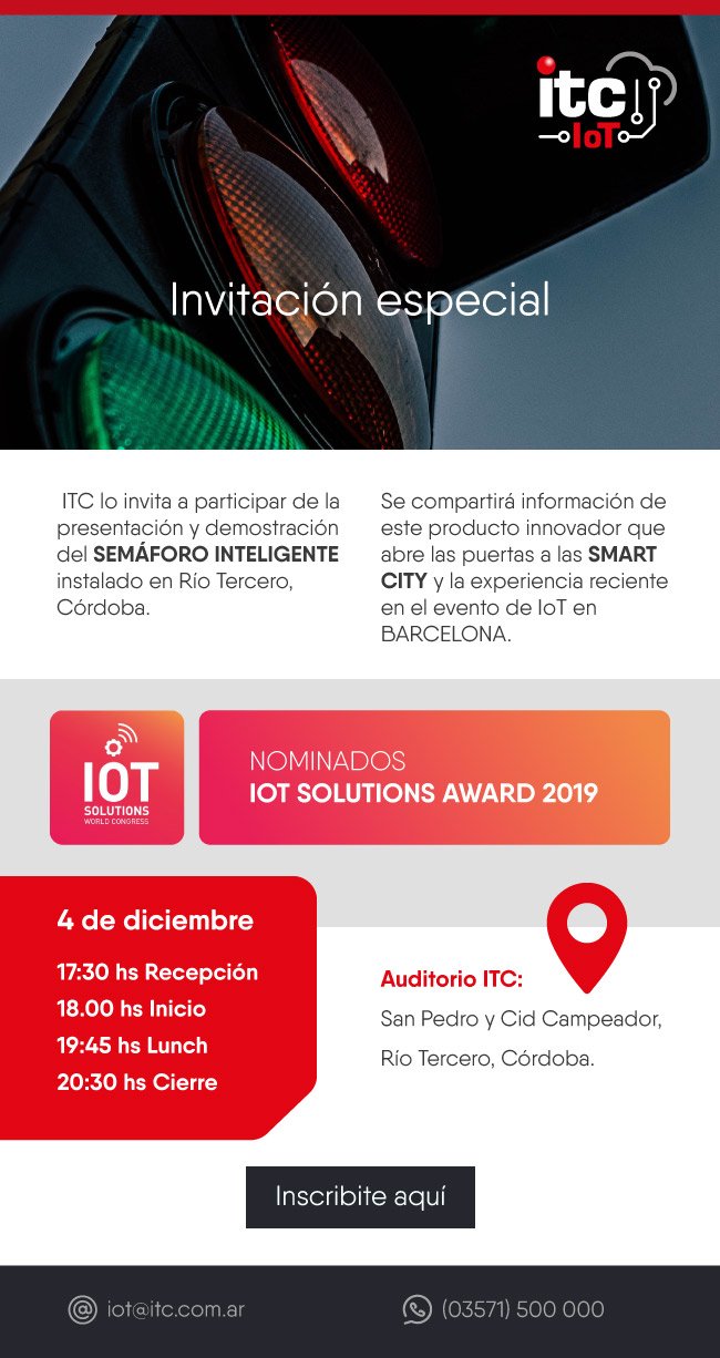 ITC y CABASE lo invita a participar de la presentación y demostración del SEMÁFORO INTELIGENTE instalado en Río Tercero, Córdoba. Se compartirá información de este producto innovador que abre las puertas a las SMART CITY y la experiencia reciente en el evento de IoT en BARCELONA.