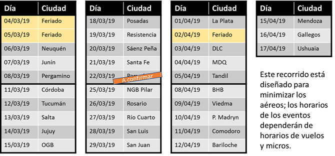 Desde el 6 de marzo al 17 de abril de 2019, estaremos haciendo una gira por